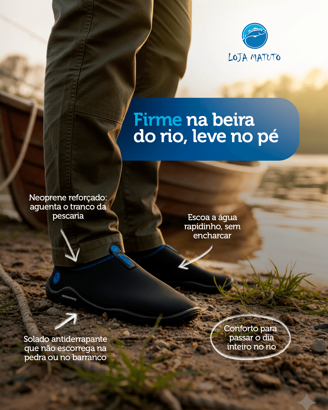 Projetada por pescadores para pescadores, a nossa sapatilha aquática combina resistência, conforto e funcionalidade em cada detalhe. Feita em Franca – a capital nacional do calçado – ela é a escolha ideal para pesca, trilhas, trabalho ou passeios em ambientes úmidos.